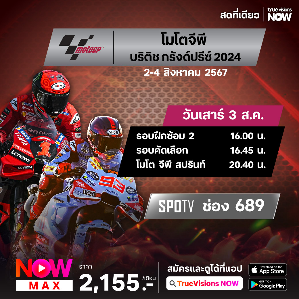 ศึกมอเตอร์ไซค์ชิงแชมป์โลก โมโต จีพี เดินทางมาถึงสนามที่ 10 ครึ่งทางของซีซั่น ในรายการ บริติช กรังด์ปรีซ์ ที่สนาม ซิลเวอร์สโตน เซอร์กิต ประเทศอังกฤษ ใครจะคว้าชัยทั้งรุ่น โมโต 3, โมโต 2 และพลาดไม่ได้กับ โมโต จีพี ที่การล่าตำแหน่งแชมป์กำลังคู่คี่สูสี ระหว่าง แชมป์ ฟรานซิสโก้ บันญาญ่า กับผู้ท้าชิง ฮอร์เฮ มาร์ติน ชมสด จุใจ ครบทุกช่วง ทางทรูวิชั่นส์