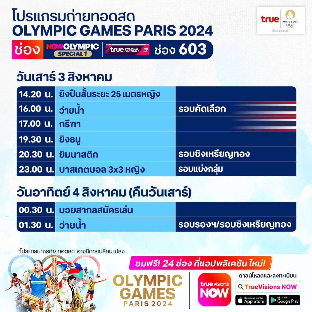 วันนี้มีอะไรดูที่ ทรูวิชั่นส์ ประจำวันเสาร์ที่ 3 สิงหาคม 67 ยังคงมีกีฬาที่น่าสนใจให้ได้ตามลุ้นตามเชียร์กันเหมือนเดิม ในส่วนของ โอลิมปิก เกมส์ 2024 ยังมีถ่ายทอดสดให้ชมกันจุใจเหมือนเคย ส่วนกีฬาอื่่นๆ ยังมีศึกโมโต จีพี รายการ บริติช กรังด์ปรีซ์, เทนนิส เอทีพี ทัวร์ และ ดับเบิ้ลยูทีเอ ทัวร์ รายการ วอชิงตัน โอเพ่น, กอล์ฟ แอลพีจีเอ ทัวร์ รายการ พอร์ทแลนด์ คลาสสิก, ยูเอฟซี ไฟต์ ไนท์ และฟุตบอลกระชับมิตรระดับสโมสร งานนี้ ทรูวิชั่นส์ จัดเต็มให้ชมกันถึงบ้าน