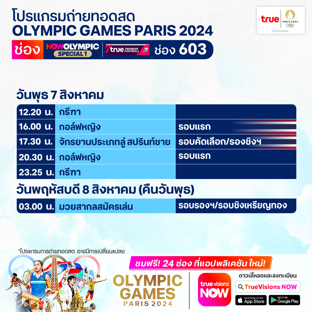 วันนี้มีอะไรดูที่ ทรูวิชั่นส์ ประจำวันพุธที่ 7 สิงหาคม 67 ยังคงมีกีฬาที่น่าสนใจให้ได้ตามลุ้นตามเชียร์กันเหมือนเดิม โดยในส่วนของ โอลิมปิก เกมส์ 2024 ยังมีถ่ายทอดสดให้ชมกันจุใจเหมือนเคย โดยเฉพาะอย่างยิ่งนักกีฬาไทย ที่มีโปรแกรมลุ้นเหรียญกันในวันนี้ นอกจากนี้ยังมีเทนนิส เอทีพี ทัวร์ และ ดับเบิ้ลยูทีเอ ทัวร์ รายการ เนชั่นแนล แบงค์ โอเพ่น งานนี้ ทรูวิชั่นส์ จัดเต็มให้ชมกันถึงบ้าน
