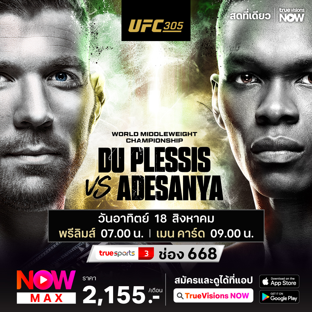 ศึกยูเอฟซี 305 กับไฟต์หยุดโลก คู่เอก ดริคัส ดูเปลซีส์ แชมป์รุ่นมิดเดิ้ลเวตคนปัจจุบันจากแอฟริกาใต้ มาป้องกันตำแหน่งกับอดีตแชมป์และขวัญใจเจ้าถิ่นชาวอิสราเอล อเดซานย่า ที่พร้อมจะทวงเข็มขัดแชมป์คืน ร่วมด้วยศึกสายเลือด คาย คาร่า ฟร้านซ์ ปะทะ สตีฟ เออร์เค้ก ชมสด เอ็กซ์คลูซีฟ ที่เดียวที่ ทรูวิชั่นส์