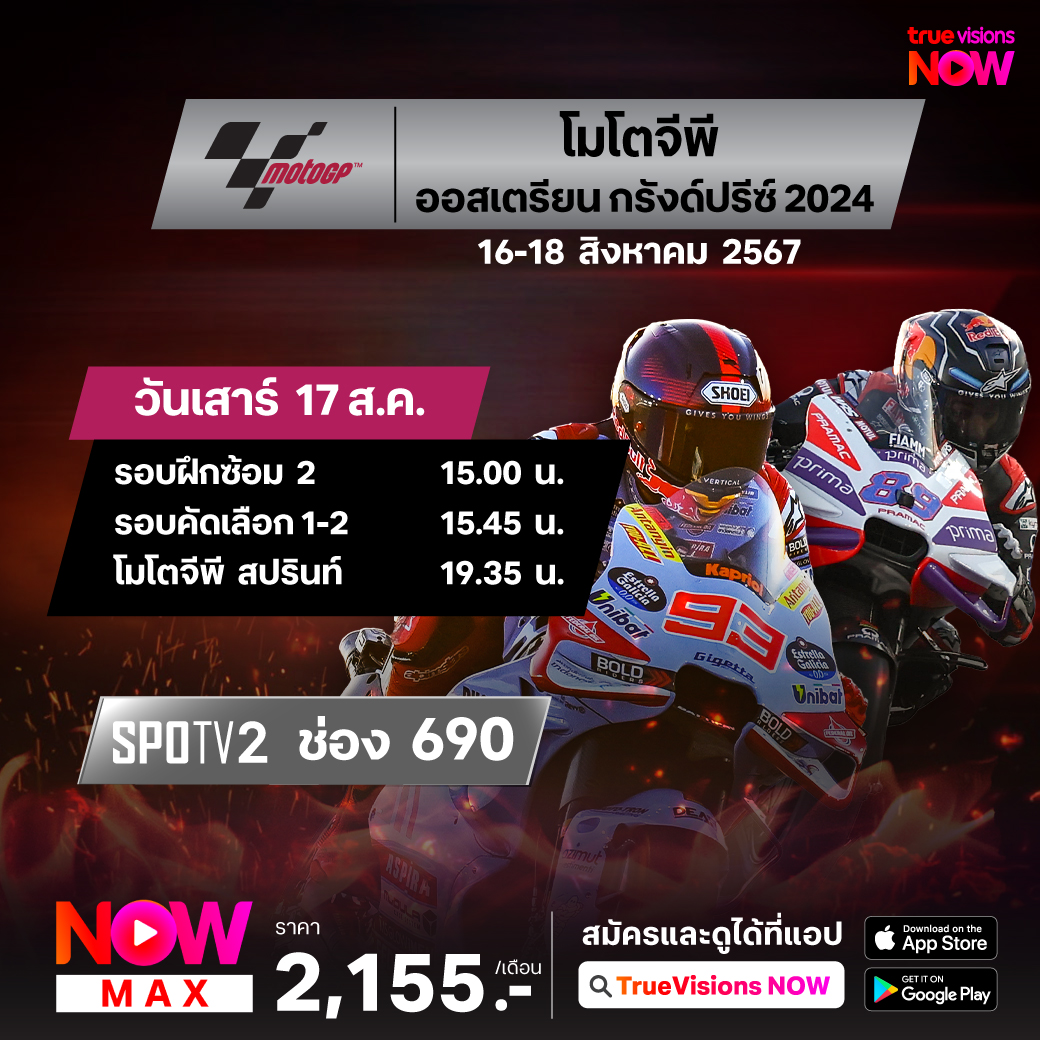 โมโต จีพี เวิลด์ แชมเปี้ยนชิพ สนามที่ 11 ในศึก ออสเตรียน กรังด์ปรีซ์ ที่สังเวียน เร้ด บูลล์ ริง เซอร์กิต ในสปีลเบิร์ก ประเทศออสเตรีย จับตาดูรุ่นใหญ่สุด โมโต จีพี ฟรานซิสโก้ บันญาญ่า แชมป์โลก 2 สมัยล่าสุดจากอิตาลี กับคู่ปรับคนสำคัญ ฮอร์เฮ มาร์ติน ที่ไม่มีใครยอมใคร กับอันดับนำในตารางคะแนนรวม และเชียร์ไทยกับ ก้อง สมเกียรติ จันทรา ในรุ่นโมโต 2 ชมสด ครบทุกช่วง ทางทรูวิชั่นส์