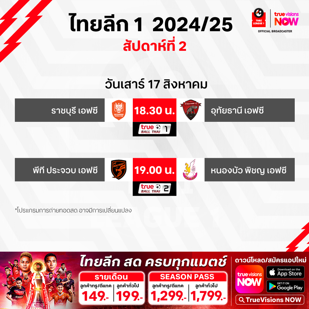 ราชบุรี เอฟซี พบ อุทัยธานี เอฟซี เวลา 18.30-20.30 ทางช่อง True Ball Thai 1