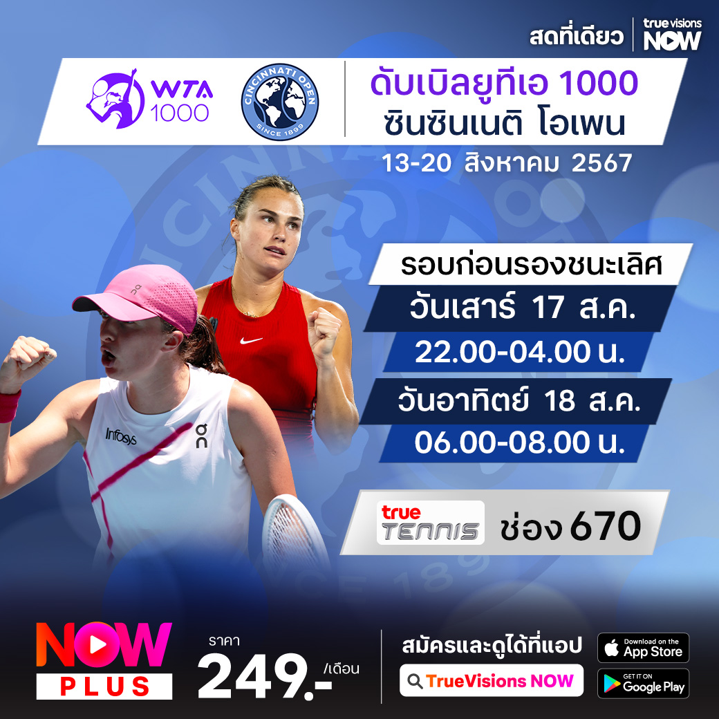 เทนนิสหญิง ดับเบิ้ลยูทีเอ ทัวร์ รายการระดับ WTA 1000 ซินซินเนติ โอเพ่น นักเทนนิสหญิงมือวางระดับโลกต่างเข้าร่วมชิงชัยกับคับคั่งเพื่อคว้าแชมป์รายการใหญ่ ก่อนจะเข้าสู่แกรนด์สแลมสุดท้ายของปี ถ่ายทอดสดจากเมืองซินซินเนติ รัฐโอไฮโอ ประเทศสหรัฐอเมริกา ร่วมลุ้นว่าใครจะคว้าแชมป์รายการนี้ไปครอง ชมสด ครบทุกรอบ ที่ ทรูวิชั่นส์