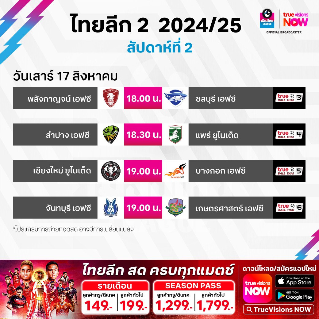 จันทบุรี เอฟซี พบ เกษตรศาสตร์ เอฟซี เวลา 19.00-21.00 ทางช่อง True Ball Thai 6
