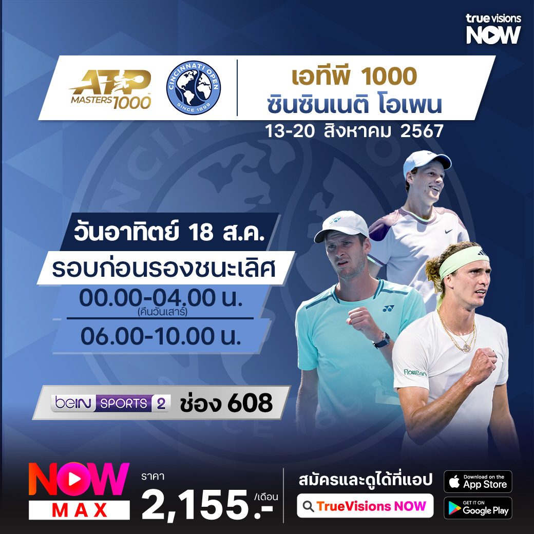 ติดตามชมการแข่งขันเทนนิสชาย เอทีพี ทัวร์ รายการระดับ ATP 1000 เตรียมความพร้อมก่อนเข้าสู่ศึกแกรนด์สแลมสุดท้ายของปี กับรายการ ซินซินเนติ โอเพ่น ถ่ายทอดสดจากเมืองซินซินเนติ รัฐโอไฮโอ ประเทศสหรัฐอเมริกา บรรดานักเทนนิสชื่อดังต่างเข้าร่วมการแข่งขันกันอย่างคับคั่ง ร่วมลุ้นกันว่าใครจะคว้าแชมป์รายการนี้ไปครอง ชมสด ครบทุกรอบที่ ทรูวิชั่นส์