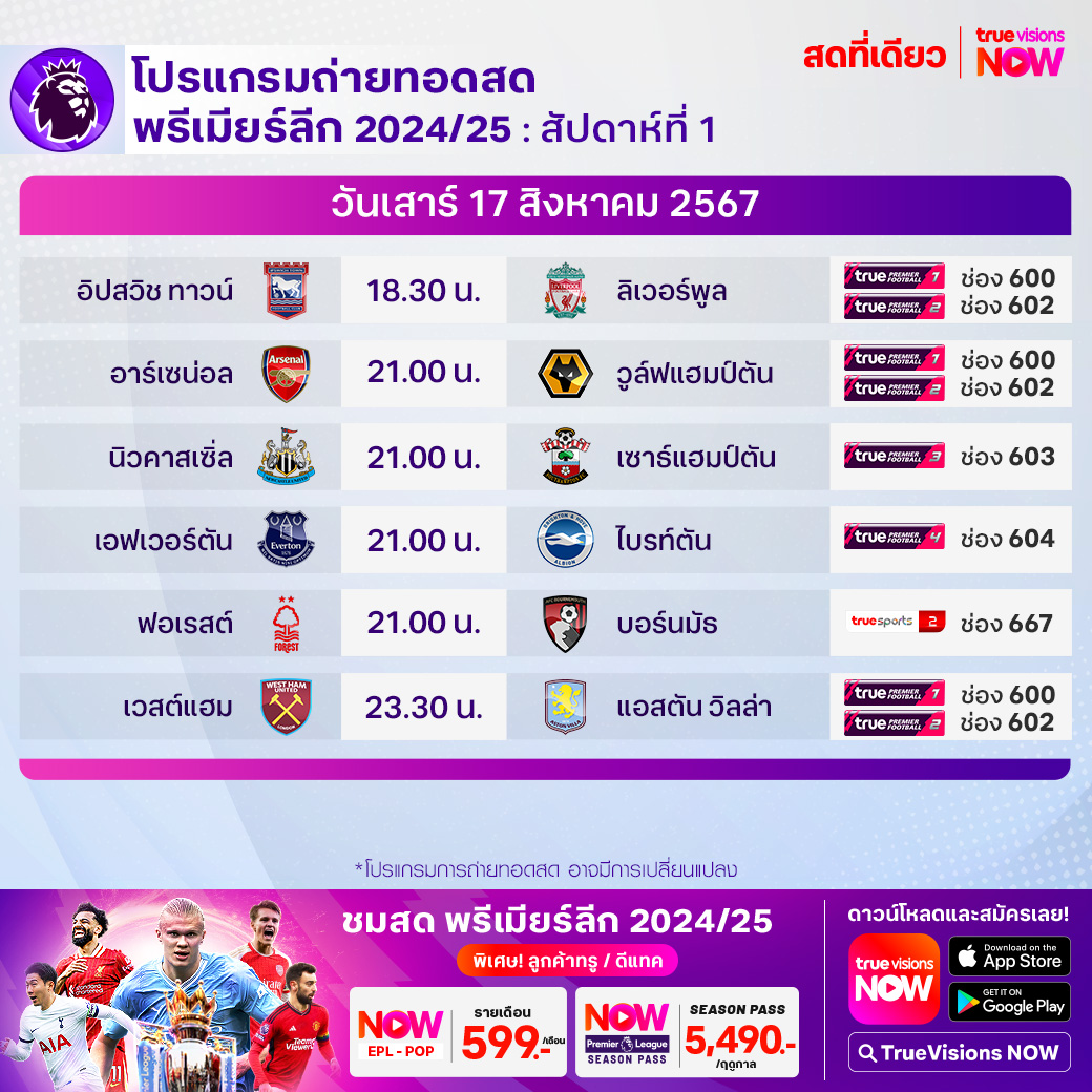 Ipswich Town vs Liverpool เวลา 18:30 - 20:30 ทางช่อง TPF 1 (600) / TPF 2 (602)