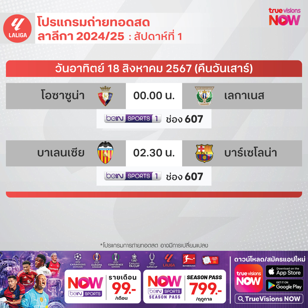 Osasuna vs Leganes เวลา 00.00-02.00 ทางช่อง beIN 1 (607)