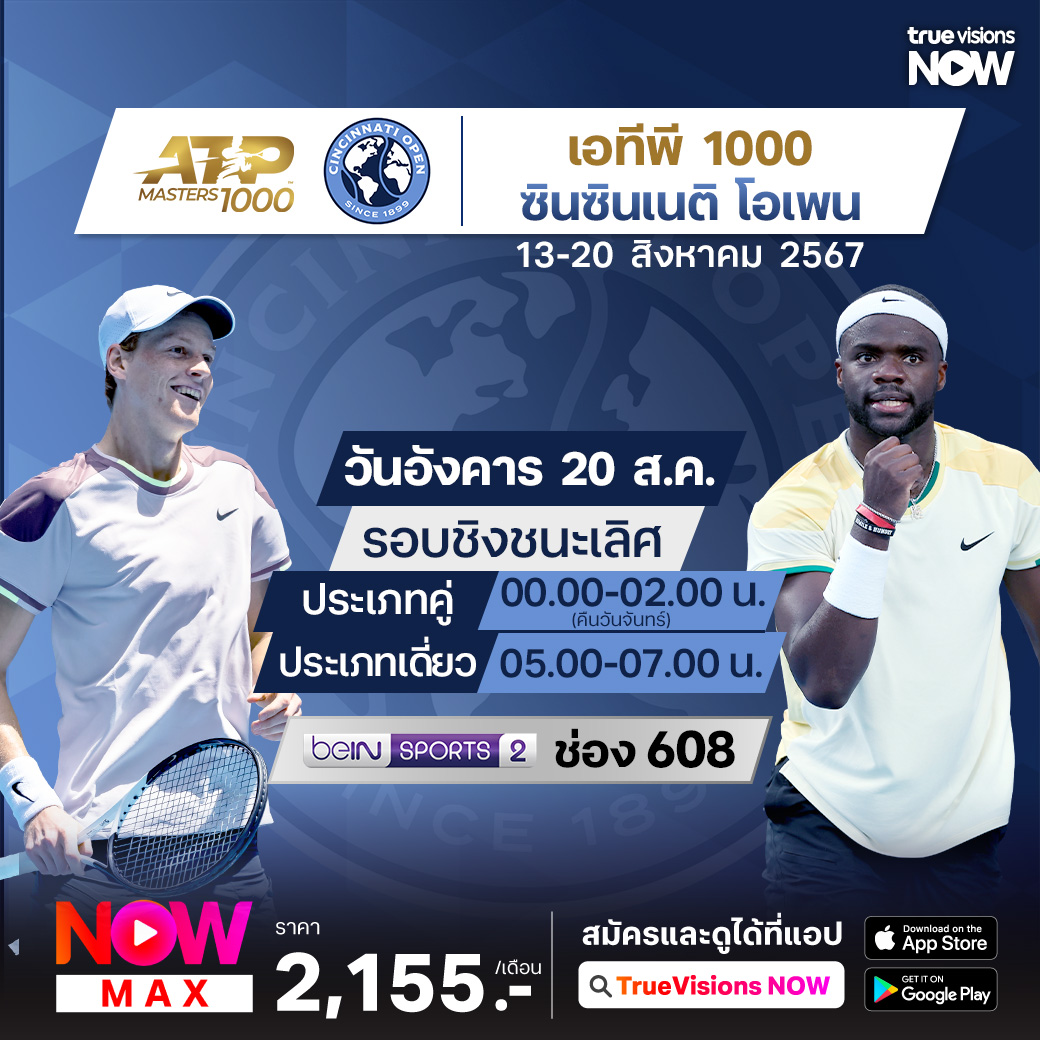 ติดตามชมการแข่งขันเทนนิสชาย เอทีพี ทัวร์ รายการระดับ ATP 1000 เตรียมความพร้อมก่อนเข้าสู่ศึกแกรนด์สแลมสุดท้ายของปี กับรายการ ซินซินเนติ โอเพ่น ถ่ายทอดสดจากเมืองซินซินเนติ รัฐโอไฮโอ ประเทศสหรัฐอเมริกา บรรดานักเทนนิสชื่อดังต่างเข้าร่วมการแข่งขันกันอย่างคับคั่ง ร่วมลุ้นกันว่าใครจะคว้าแชมป์รายการนี้ไปครอง ชมสด ครบทุกรอบที่ ทรูวิชั่นส์