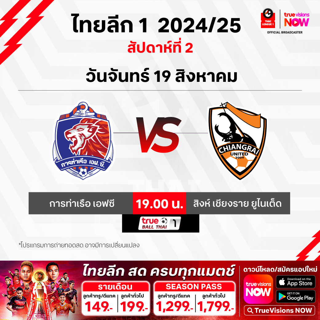 การท่าเรือ เอฟซี พบ สิงห์ เชียงราย ยูไนเต็ด เวลา 19.00-21.00 ทางช่อง True Ball Thai 1