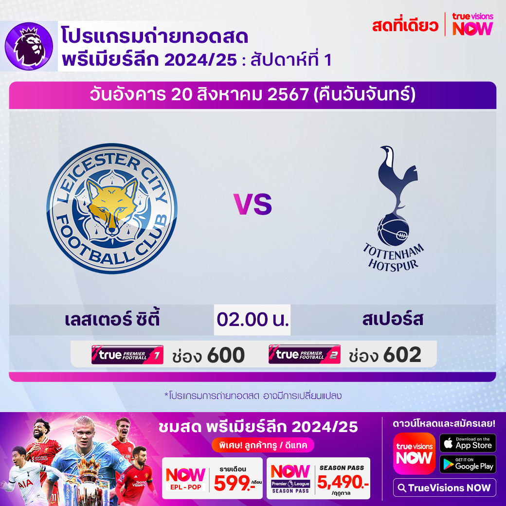 Leicester City vs Tottenham Hotspur เวลา 02:00 - 04:00 ทางช่อง TPF 1 (600) / TPF 2 (602)