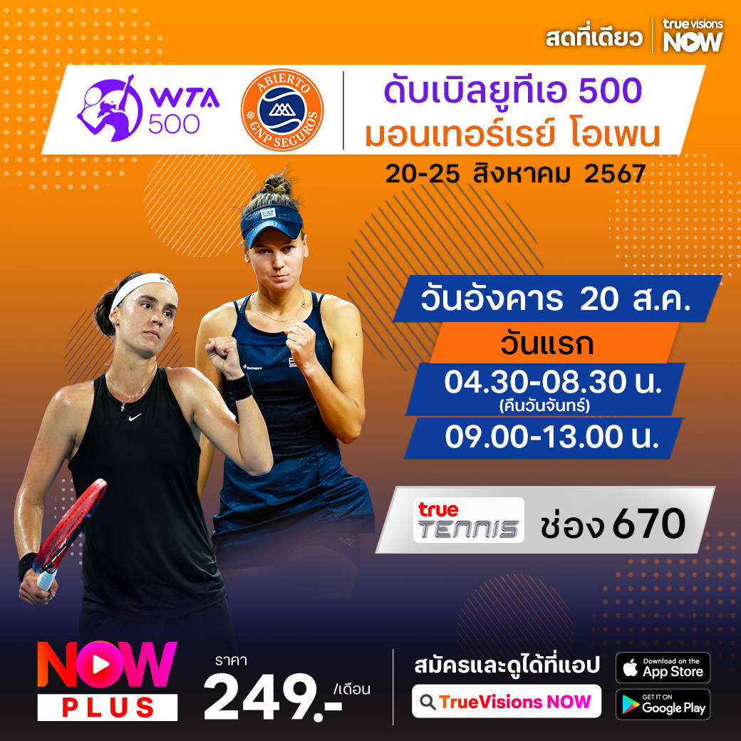 ติดตามชมเทนนิสหญิง ดับเบิ้ลยูทีเอ ทัวร์ รายการ มอนเทอร์เรย์ โอเพ่น ที่ประเทศเม็กซิโก รายการสุดท้ายเพื่อเตรียมตัวก่อนเข้าสู่แกรนด์สแลมสุดท้ายของปี ยูเอส โอเพ่น ร่วมลุ้นกันว่าใครจะจะคว้าแชมป์ไปครอง ชมสด ครบทุกรอบที่ ทรูวิชั่นส์