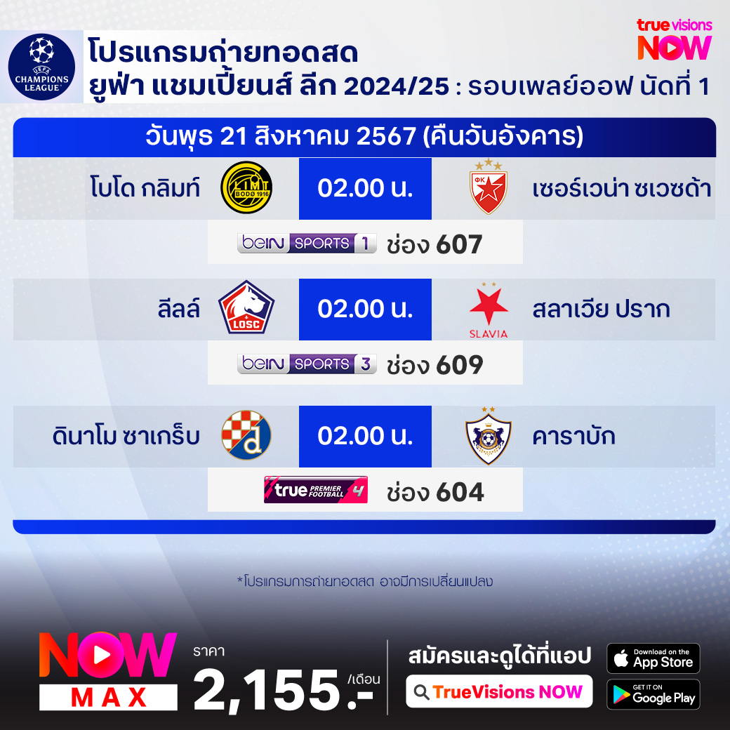 Bodo/Glimt vs Crvena Zvezda เวลา 02.00-04.00 ทางช่อง beIN 1 (607)