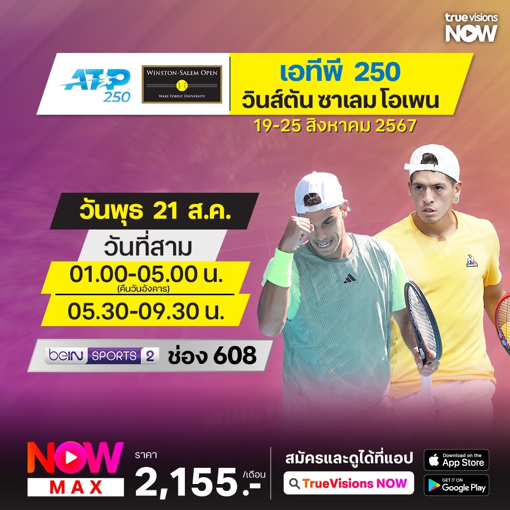 ติดตามชมเทนนิสชาย เอทีพี ทัวร์ รายการ วินสตัน-ซาเล็ม โอเพ่น ซึ่งรายการนี้จะเป็นรายการสุดท้ายที่นักกีฬาจะได้เตรียมตัวเข้าสู่แกรนด์สแลมสุดท้ายของปี ร่วมติดตามว่าใครจะได้แชมป์เพื่อเรียกความมั่นใจก่อนหน้าศึก ยูเอส โอเพ่น ชมสด ครบทุกรอบที่ ทรูวิชั่นส์