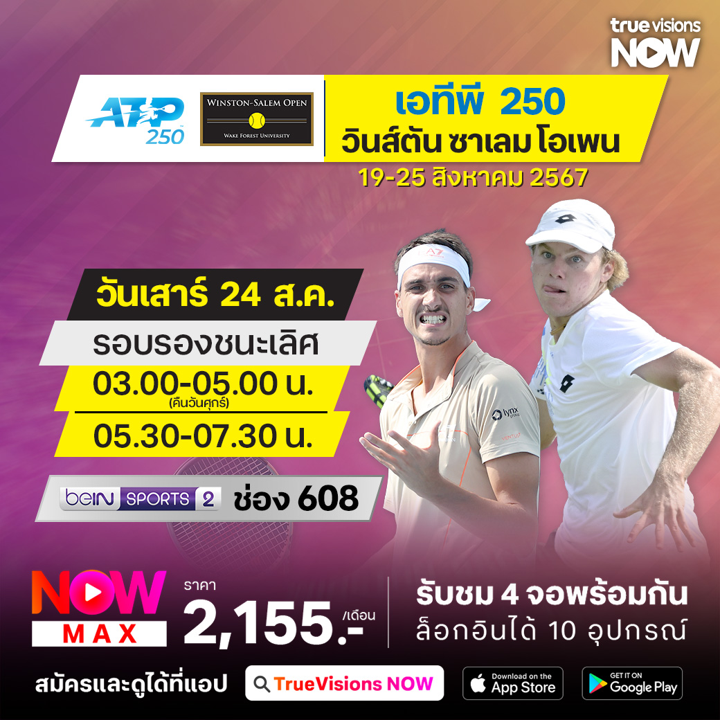 ติดตามชมเทนนิสชาย เอทีพี ทัวร์ รายการ วินสตัน-ซาเล็ม โอเพ่น ซึ่งรายการนี้จะเป็นรายการสุดท้ายที่นักกีฬาจะได้เตรียมตัวเข้าสู่แกรนด์สแลมสุดท้ายของปี ร่วมติดตามว่าใครจะได้แชมป์เพื่อเรียกความมั่นใจก่อนหน้าศึก ยูเอส โอเพ่น ชมสด ครบทุกรอบที่ ทรูวิชั่นส์