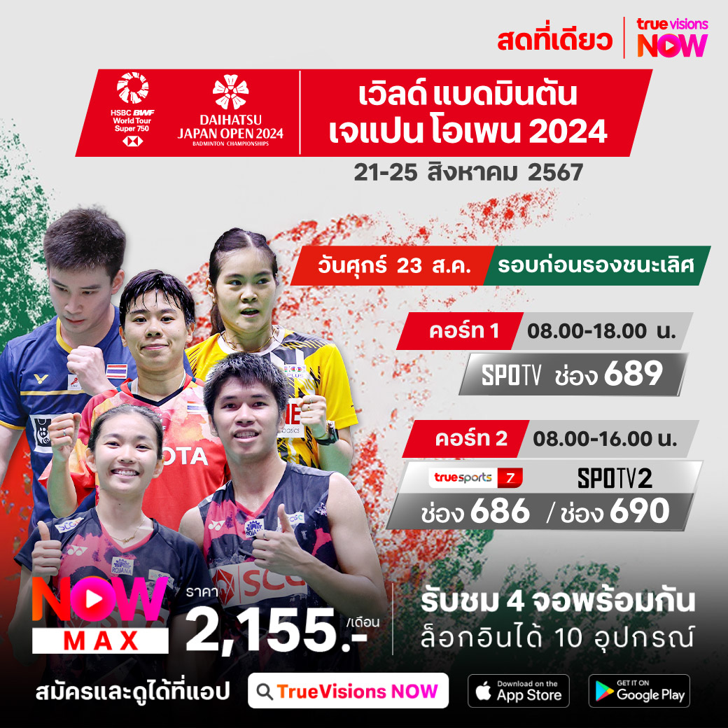 แบดมินตัน บีดับเบิ้ลยูเอฟ รายการ เจแปน โอเพ่น 2024 ที่เมืองโยโกฮาม่า รายการเก็บคะแนนสะสมโลก ระดับ เวิลด์ ทัวร์ ซูเปอร์ 750 ชิงเงินรางวัลมากถึง 850,000 เหรียญสหรัฐฯ ร่วมเชียร์ไทยสู้กับนักกีฬาระดับโลก สดจุใจ ที่เดียวที่ ทรูวิชั่นส์