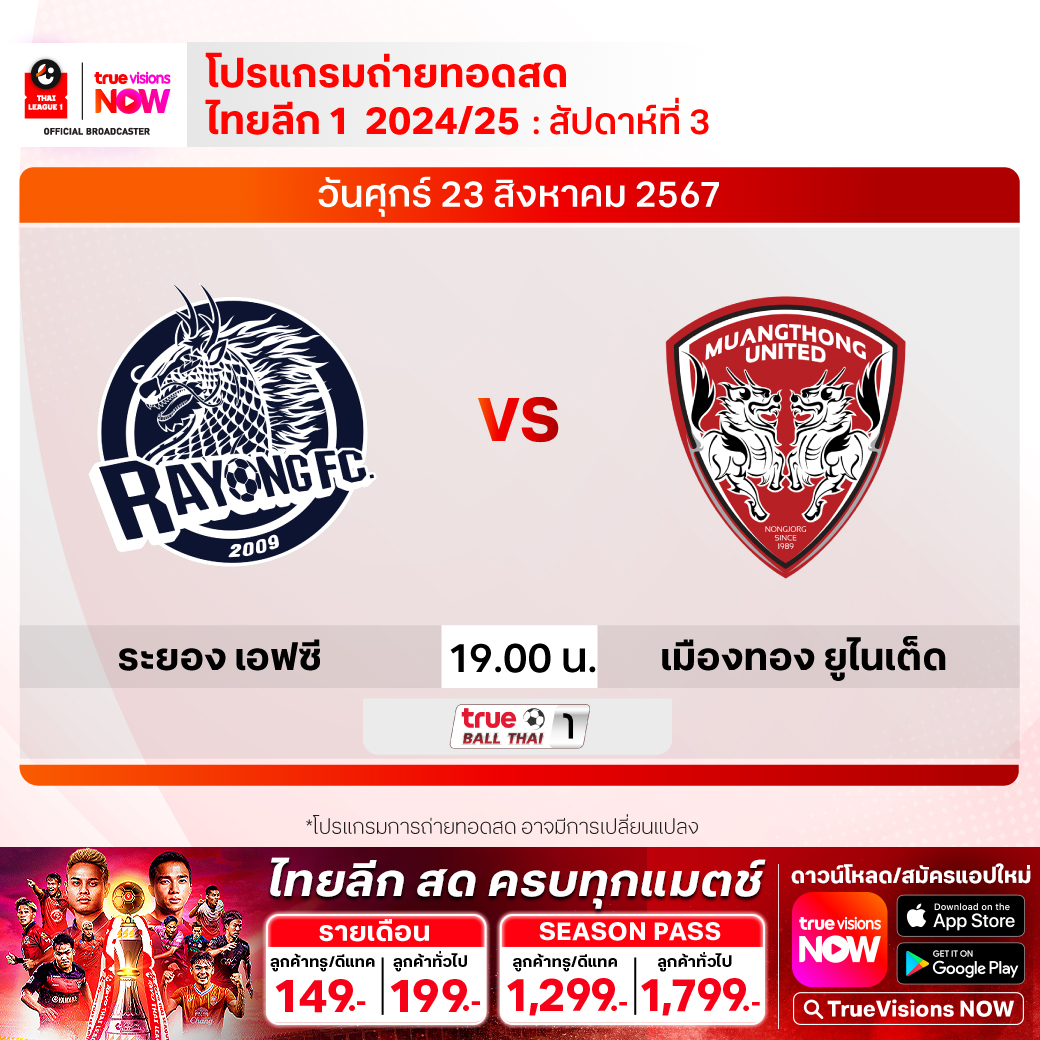 ระยอง เอฟซี พบ เมืองทอง ยูไนเต็ด เวลา 19.00-21.00 ทางช่อง True Ball Thai 1