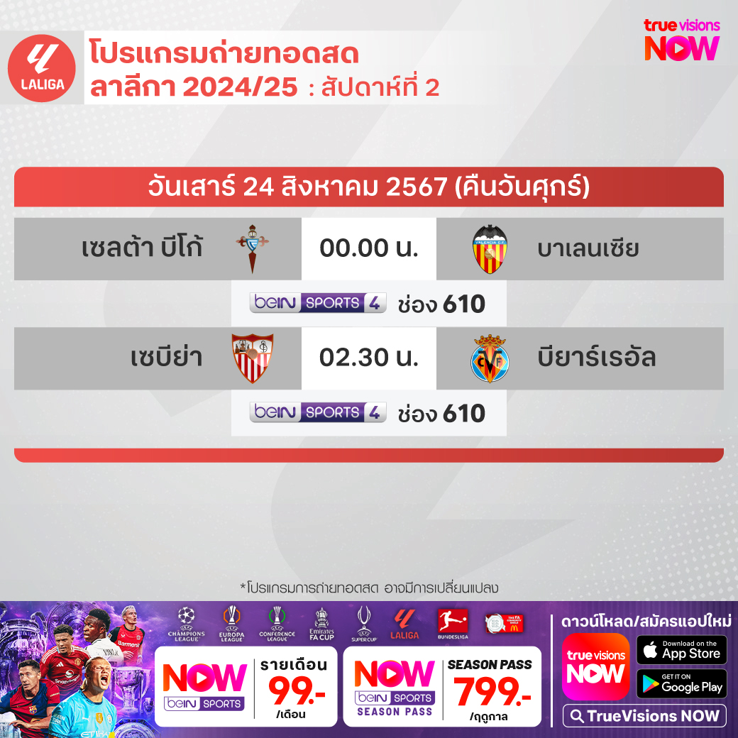 Sevilla vs Villarreal เวลา 02.30-04.30 ทางช่อง beIN 4 (610)