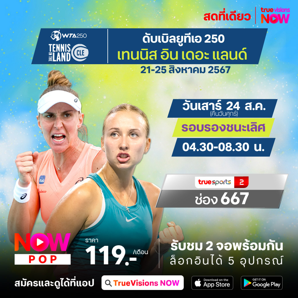 ติดตามชมเทนนิสหญิง ดับเบิ้ลยูทีเอ ทัวร์ ระดับ 250 รายการ เทนนิส อิน เดอะ แลนด์ จากเมืองคลีฟแลนด์ รัฐโอไฮโอ รายการสุดท้ายเพื่อเตรียมตัวก่อนเข้าสู่แกรนด์สแลมสุดท้ายของปี ยูเอส โอเพ่น ร่วมลุ้นกันว่าใครจะจะคว้าแชมป์ไปครอง ชมสด ที่ ทรูวิชั่นส์