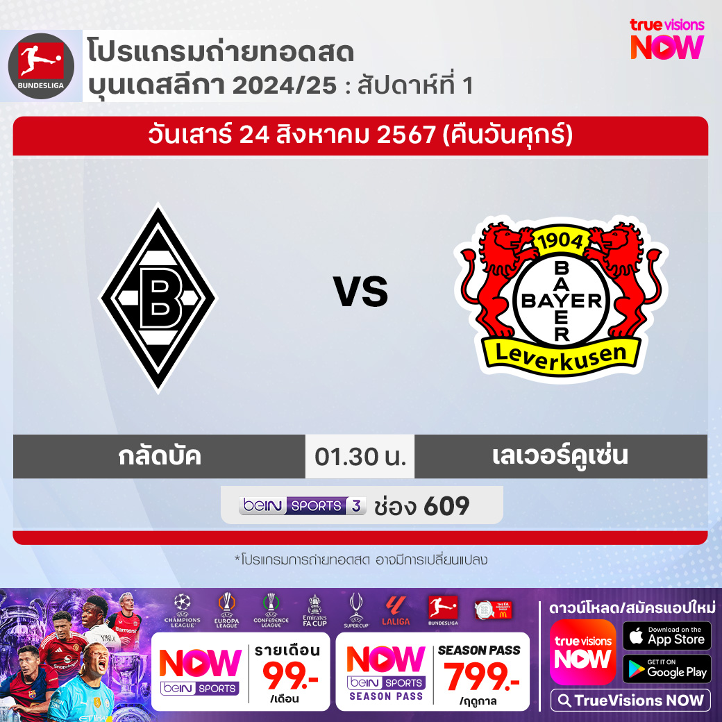 Monchengladbach vs Leverkusen เวลา 01.30-04.30 ทางช่อง beIN 3 (609)