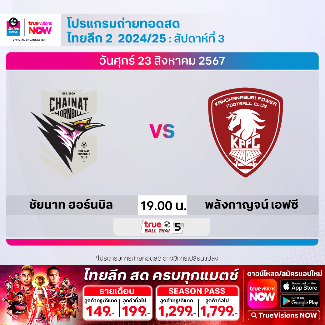 ชัยนาท ฮอร์นบิล พบ พลังกาญจน์ เอฟซี เวลา 19.00-21.00 ทางช่อง True Ball Thai 5