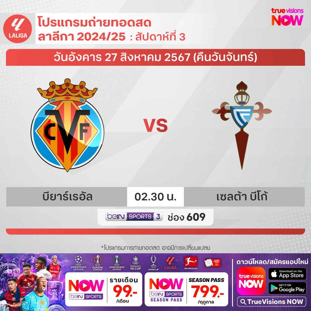 Villarreal vs Celta Vigo เวลา 02.30-04.30 ทางช่อง beIN 3 (609)