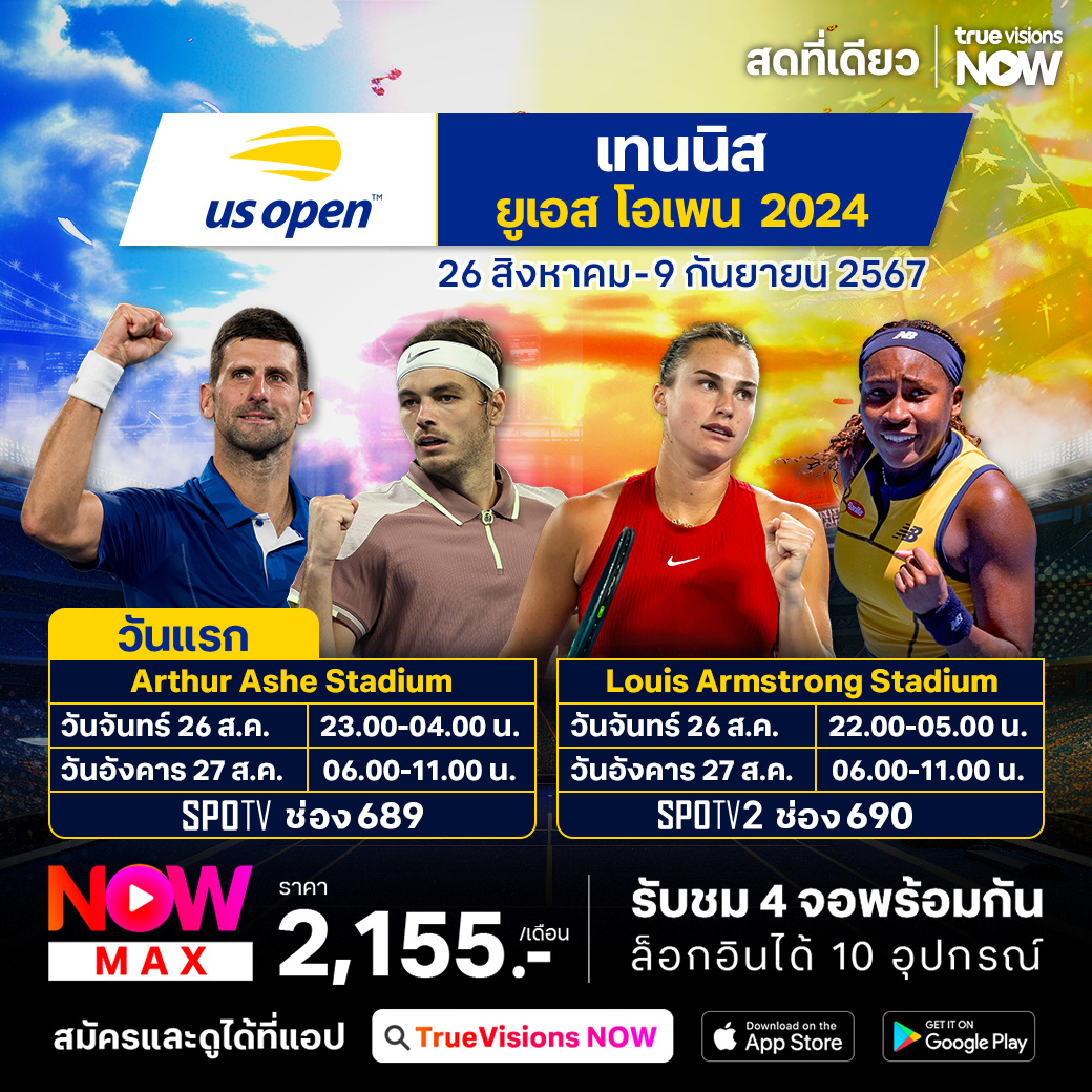 วันแรก ARTHUR ASHE STADIUM เวลา 23.00 - 04.00 / 06.00 - 11.00 ทางช่อง SPOTV (689)