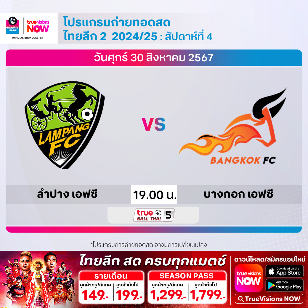 ลำปาง เอฟซี พบ บางกอก เอฟซี เวลา 19.00-21.00 ทางช่อง True Ball Thai 5