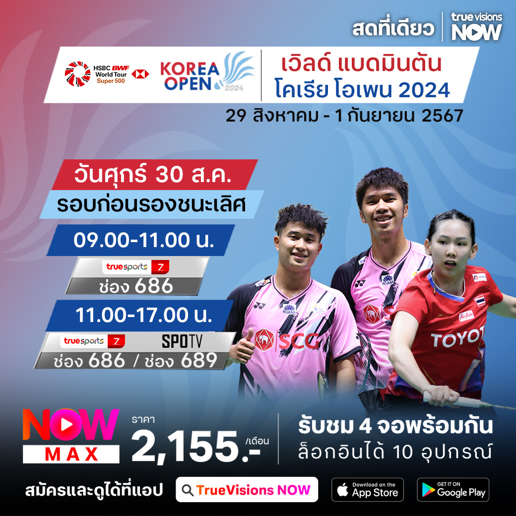 แฟนๆ กีฬาแบดมินตัน มันส์กันต่อกับรายการเก็บคะแนนสะสมโลกระดับ เวิลด์ ทัวร์ ซูเปอร์ 500 โคเรีย โอเพ่น 2024 ที่กรุงโซล ประเทศเกาหลีใต้ ร่วมเชียร์ทีมแบดมินตันไทย ตบเพื่อคว้าชัยกับนักแบดมินตันชั้นนำของเจ้าถิ่นและจากทั่วโลก ใครจะเข้ารอบ ใครจะถึงตำแหน่งแชมป์ ลุ้นกันสดๆ เอ็กซ์คลูซีฟ ที่เดียวที่ ทรูวิชั่นส์
