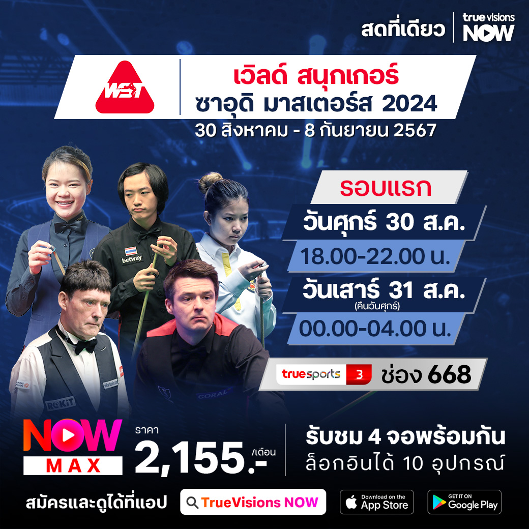 ศึก เวิลด์ สนุกเกอร์ ต้อนรับฤดูกาลใหม่ 2024/25 กับความยิ่งใหญ่อลังการของรายการ ซาอุดิ มาสเตอร์ส ที่รวบรวมเอาสุดยอดนักสนุกเกอร์ชั้นนำของโลก นำโดยซูเปอร์สตาร์อย่าง รอนนี่ โอซัลลิแวน, ไคเรน วินสัน แชมป์โลกคนล่าสุด, จั๊ดด์ ทรัมป์ และ มือไวลด์การ์ด 17 คน รวมทั้งยังร่วมเชียร์นักสอยคิวจากไทยให้คว้าชัยในรายการใหญ่สัปดาห์นี้ ใครจะเป็นแชมป์ ชมสด เอ็กซ์คลูซีฟ ครบทุกรอบ ที่เดียวที่ ทรูวิชั่นส์