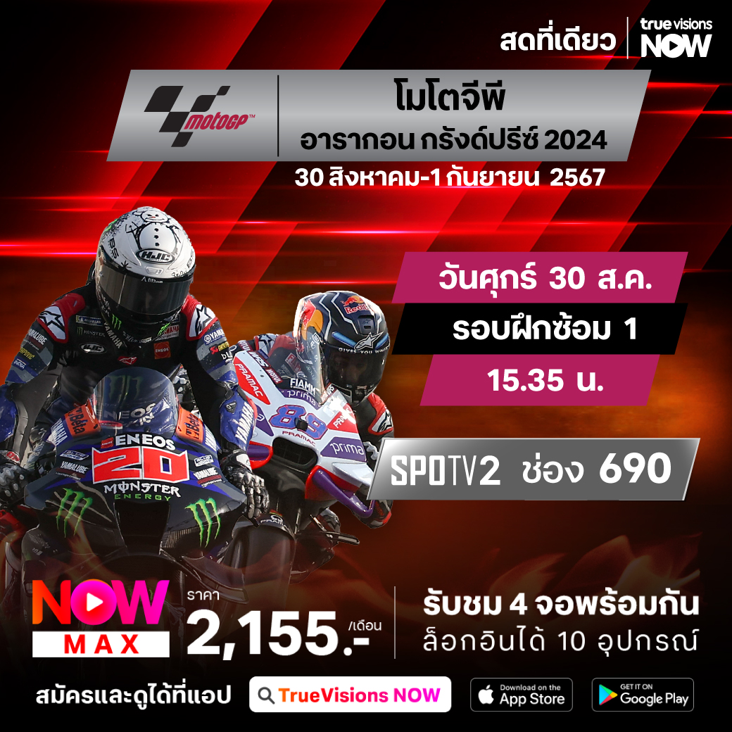 ศึกโมโต จีพี ดวลความเร็วและชิงตำแหน่งบนโพเดี้ยม สนามที่ 12 รายการ อารากอน กรังด์ปรีซ์ ที่สังเวียนมอเตอร์สปอร์ตแลนด์ ในอารากอน ประเทศสเปน ร่วมลุ้นกันว่าใครจะเป็นแชมป์ โดยเฉพาะรุ่นใหญ่สุด โมโต จีพี ที่สองอันดับแรกบนตารางคะแนนกำลังเบียดสู้กันอย่างสนุกสูสี ชมสด ทุกช่วง ทางทรูวิชั่นส์