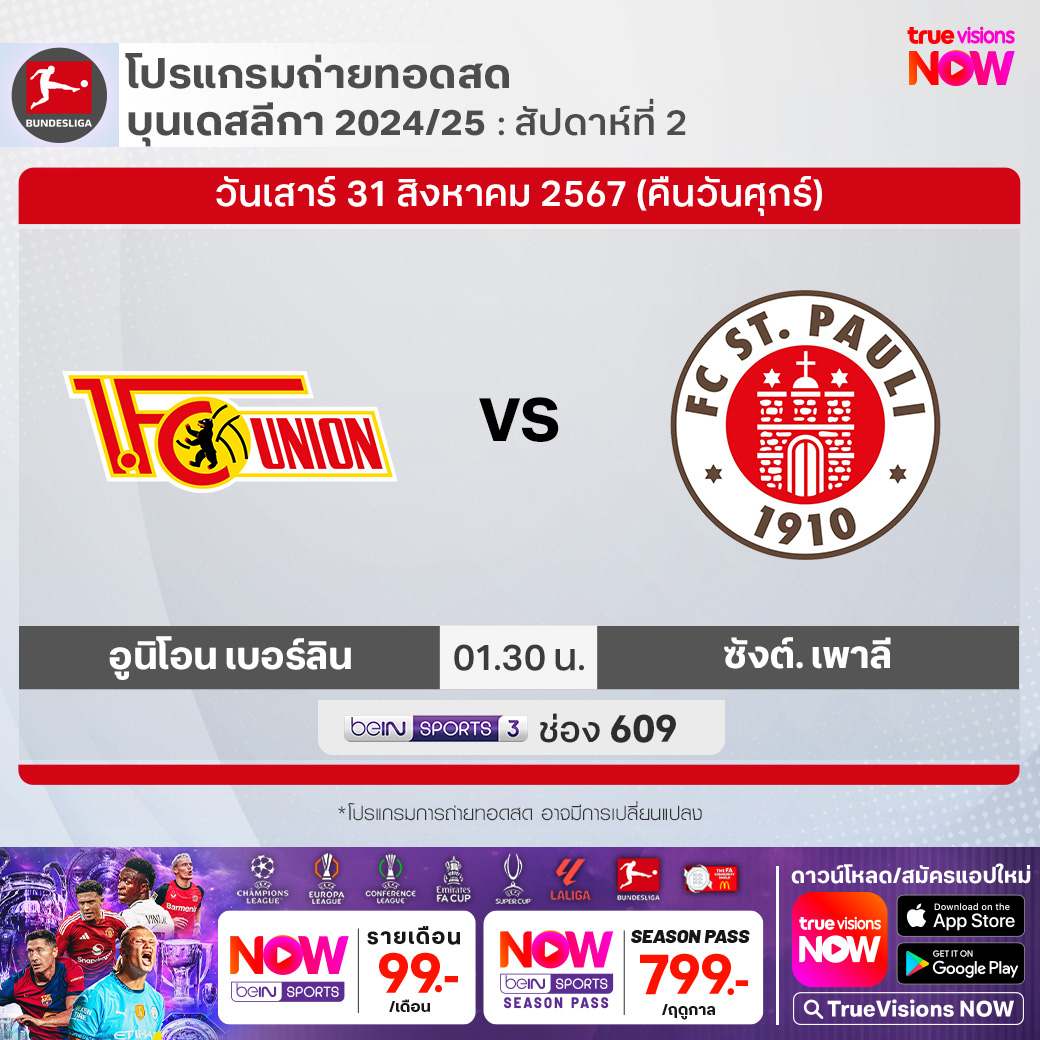 FC Union vs St. Pauli เวลา 01.30-03.30 ทางช่อง beIN 3 (609)