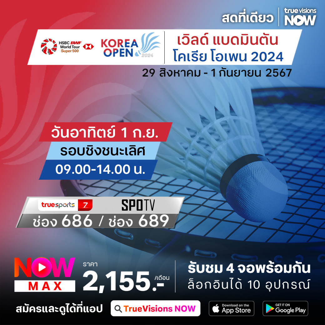 แฟนๆ กีฬาแบดมินตัน มันส์กันต่อกับรายการเก็บคะแนนสะสมโลกระดับ เวิลด์ ทัวร์ ซูเปอร์ 500 โคเรีย โอเพ่น 2024 ที่กรุงโซล ประเทศเกาหลีใต้ ใครจะคว้าแชมป์รายการนี้ไปครอง ลุ้นกันสดๆ เอ็กซ์คลูซีฟ ที่เดียวที่ ทรูวิชั่นส์