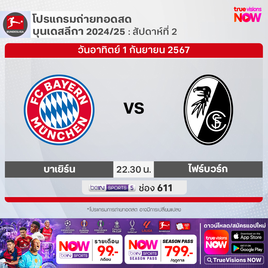 Bayern vs Freiburg เวลา 22.30-00.30 ทางช่อง beIN 5 (611)