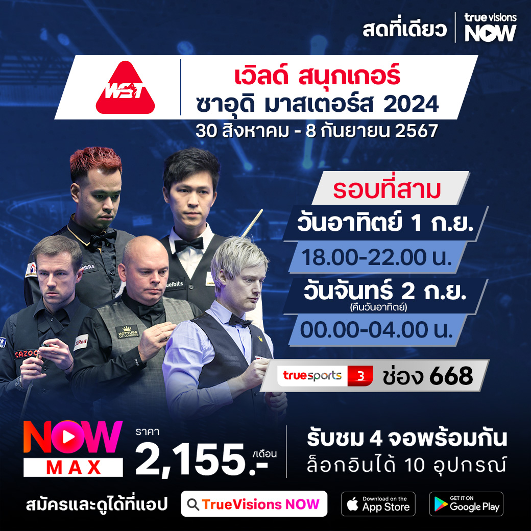 ศึก เวิลด์ สนุกเกอร์ ต้อนรับฤดูกาลใหม่ 2024/25 กับความยิ่งใหญ่อลังการของรายการ ซาอุดิ มาสเตอร์ส ที่รวบรวมเอาสุดยอดนักสนุกเกอร์ชั้นนำของโลก นำโดยซูเปอร์สตาร์อย่าง รอนนี่ โอซัลลิแวน, ไคเรน วินสัน แชมป์โลกคนล่าสุด, จั๊ดด์ ทรัมป์ และ มือไวลด์การ์ด 17 คน รวมทั้งยังร่วมเชียร์นักสอยคิวจากไทยให้คว้าชัยในรายการใหญ่สัปดาห์นี้ ใครจะเป็นแชมป์ ชมสด เอ็กซ์คลูซีฟ ครบทุกรอบ ที่เดียวที่ ทรูวิชั่นส์