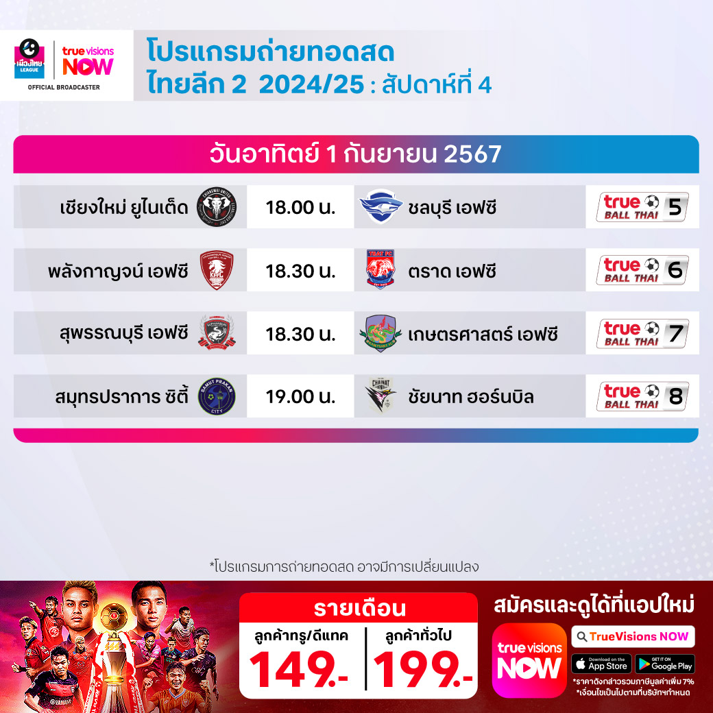 ราชบุรี เอฟซี พบ การท่าเรือ เอฟซี เวลา 18.00-20.00 ทางช่อง True Ball Thai 1