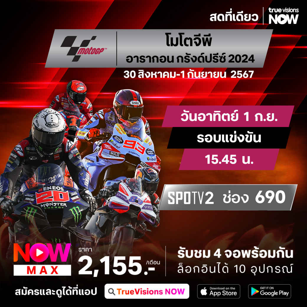 ศึกโมโต จีพี ดวลความเร็วและชิงตำแหน่งบนโพเดี้ยม สนามที่ 12 รายการ อารากอน กรังด์ปรีซ์ ที่สังเวียนมอเตอร์สปอร์ตแลนด์ ในอารากอน ประเทศสเปน ร่วมลุ้นกันว่าใครจะเป็นแชมป์ โดยเฉพาะรุ่นใหญ่สุด โมโต จีพี ที่สองอันดับแรกบนตารางคะแนนกำลังเบียดสู้กันอย่างสนุกสูสี ชมสด ทุกช่วง ทางทรูวิชั่นส์