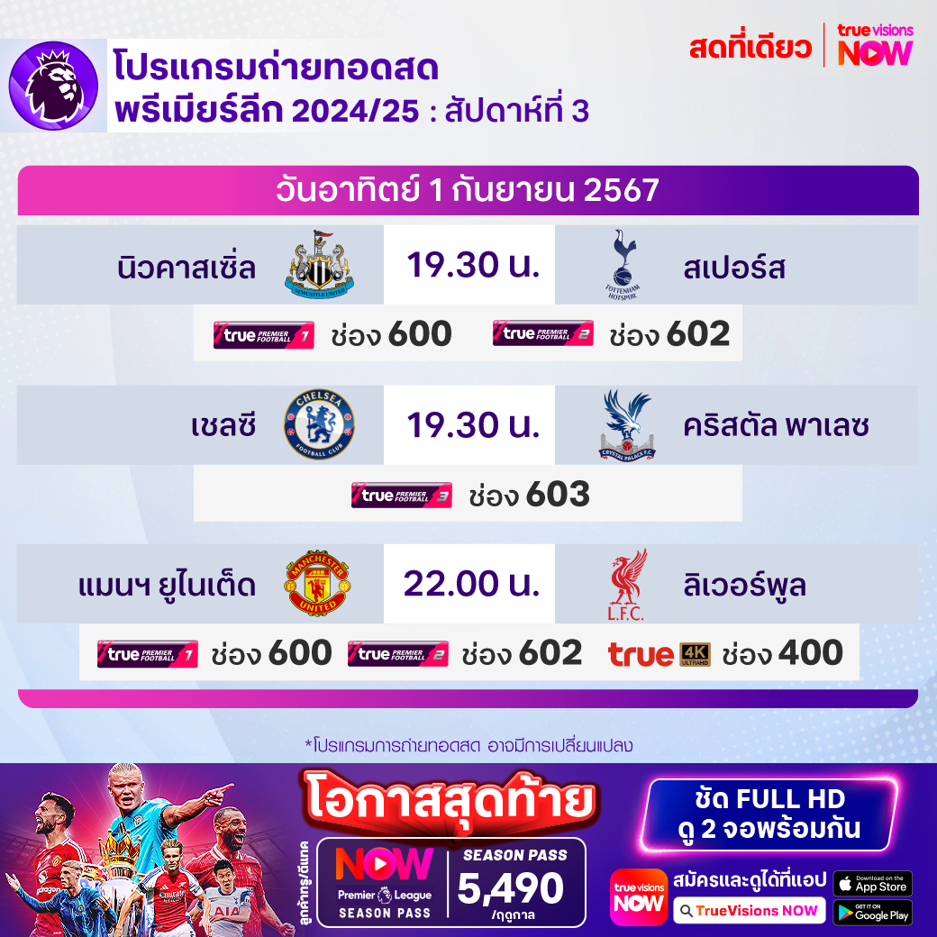 Man Utd vs Liverpool เวลา 22:00 - 00:00 ทางช่อง TPF 1 (600) / TPF 2 (602) /4K(400)