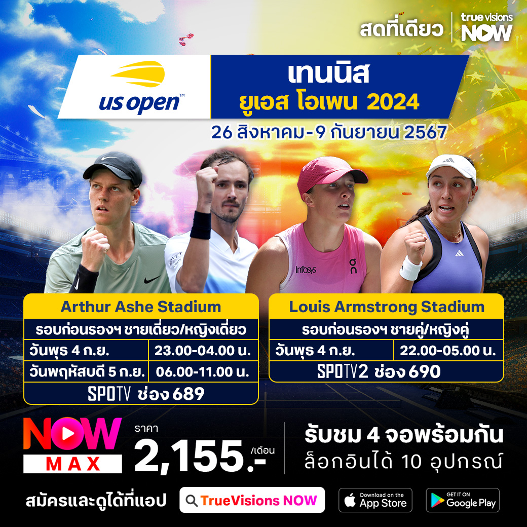 รอบก่อนรองชนะเลิศ ชายเดี่ยว/หญิงเดี่ยว ARTHUR ASHE STADIUM เวลา 23.00 - 04.00 / 06.00 - 11.00 ทางช่อง SPOTV (689)