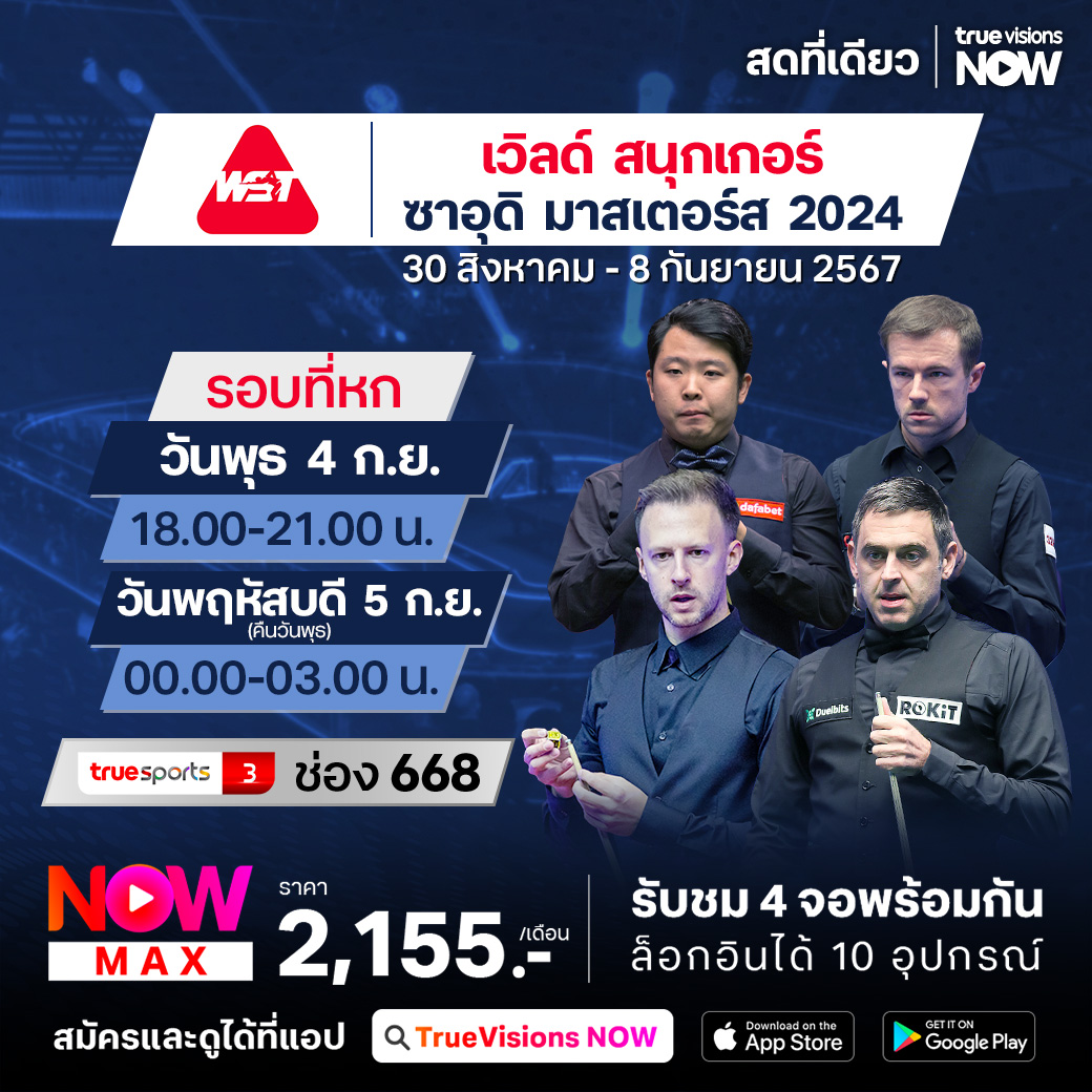 ศึก เวิลด์ สนุกเกอร์ ต้อนรับฤดูกาลใหม่ 2024/25 กับความยิ่งใหญ่อลังการของรายการ ซาอุดิ มาสเตอร์ส ที่รวบรวมเอาสุดยอดนักสนุกเกอร์ชั้นนำของโลก นำโดยซูเปอร์สตาร์อย่าง รอนนี่ โอซัลลิแวน, ไคเรน วินสัน แชมป์โลกคนล่าสุด, จั๊ดด์ ทรัมป์ และ มือไวลด์การ์ด 17 คน รวมทั้งยังร่วมเชียร์นักสอยคิวจากไทยให้คว้าชัยในรายการใหญ่สัปดาห์นี้ ใครจะเป็นแชมป์ ชมสด เอ็กซ์คลูซีฟ ครบทุกรอบ ที่เดียวที่ ทรูวิชั่นส์