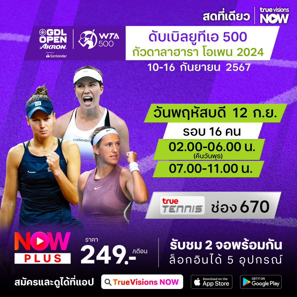 เทนนิสหญิงดับเบิ้ลยูทีเอ ทัวร์ สัปดาห์นี้พบกับรายการระดับ WTA 500 กัวดาลาฮารา โอเพ่น ที่ประเทศเม็กซิโก เป็นรายการต่อเนื่องหลังจากจบศึก ยูเอส โอเพ่น แกรนด์สแลมสุดท้ายของปี ร่วมลุ้นว่าใครจะคว้าแชมป์รายการนี้ไปครอง ชมสด ครบทุกรอบที่ ทรูวิชั่นส์