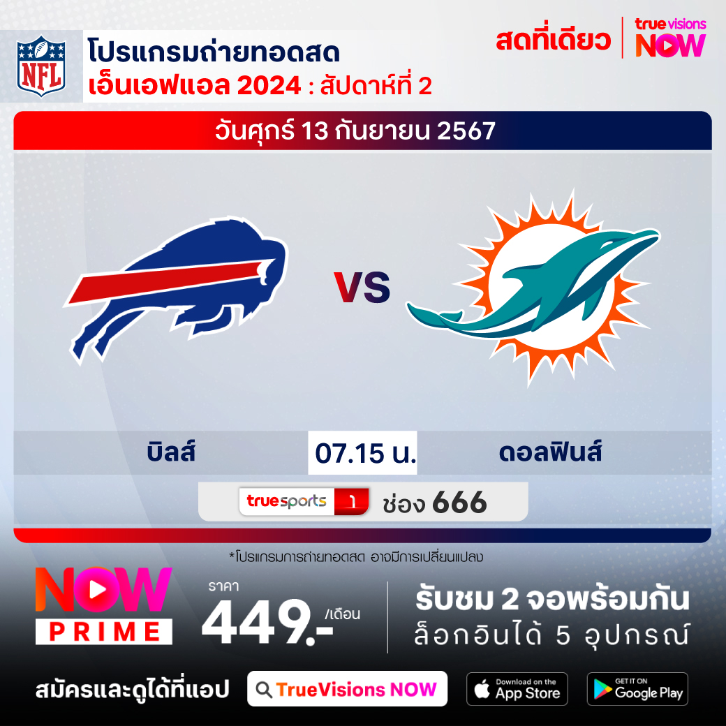 วันศุกร์ 13 ก.ย. Bills Vs Dolphins เวลา 07.15 ทางช่อง TS 1 (666)