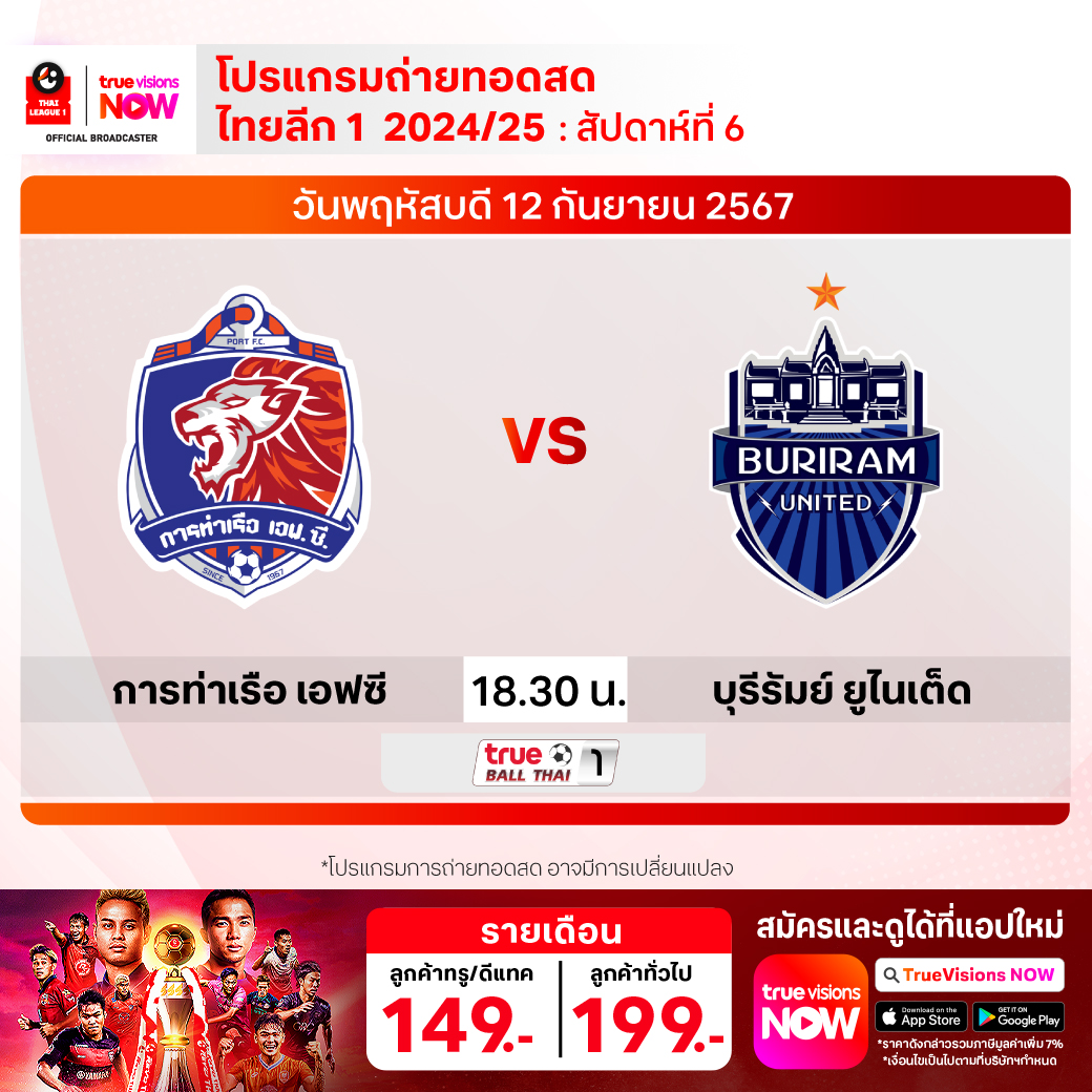 การท่าเรือ เอฟซี พบ บุรีรัมย์ ยูไนเต็ด เวลา 18.30-20.30 ทางช่อง True Ball Thai 1