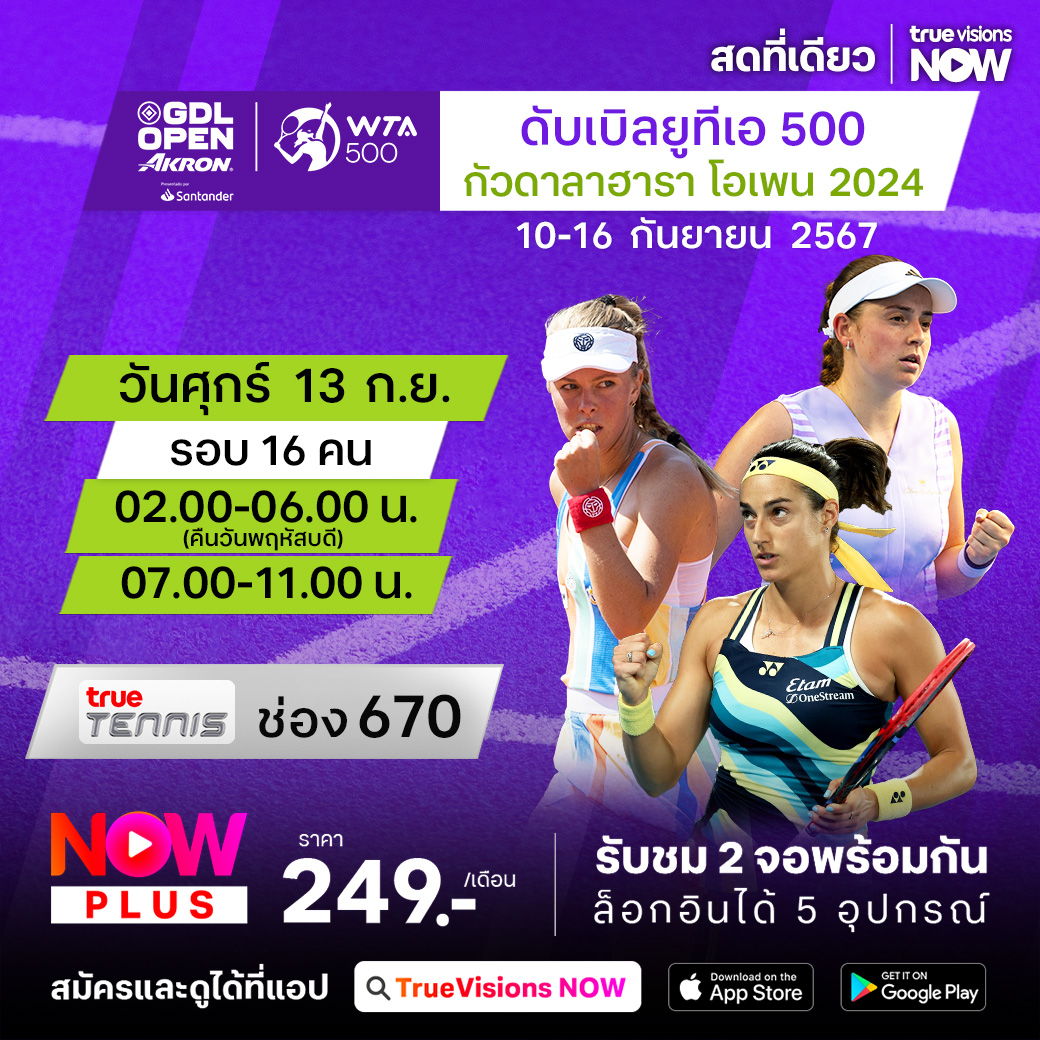 เทนนิสหญิงดับเบิ้ลยูทีเอ ทัวร์ สัปดาห์นี้พบกับรายการระดับ WTA 500 กัวดาลาฮารา โอเพ่น ที่ประเทศเม็กซิโก เป็นรายการต่อเนื่องหลังจากจบศึก ยูเอส โอเพ่น แกรนด์สแลมสุดท้ายของปี ร่วมลุ้นว่าใครจะคว้าแชมป์รายการนี้ไปครอง ชมสด ครบทุกรอบที่ ทรูวิชั่นส์