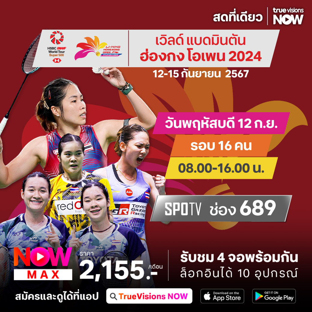 แบดมินตัน บีดับเบิ้ลยูเอฟ รายการ ฮ่องกง โอเพ่น 2024 ความมันส์ระดับ เวิลด์ ทัวร์ ซูเปอร์ 500 ร่วมเชียร์ทีมแบดมินตันไทย สู้สุดใจเพื่อคว้าชัยชนะเหนือคู่แข่งระดับโลก ใครจะเป็นแชมป์ในปีนี้ ลุ้นกันสนุกถึงรอบชิงชนะเลิศ ชมสด เอ็กซ์คลูซีฟ ที่เดียวที่ ทรูวิชั่นส์