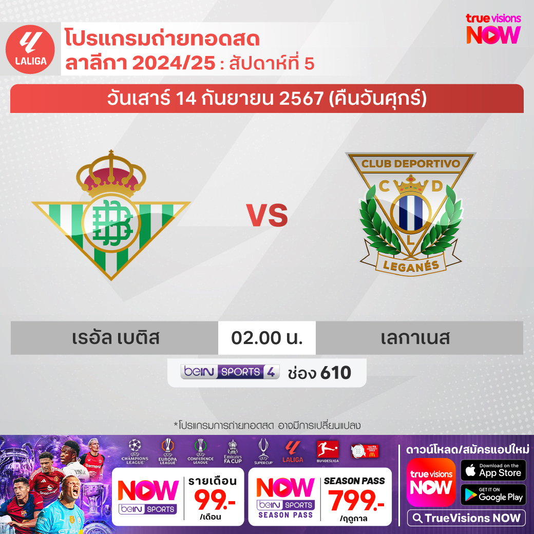 Real Betis vs Leganes เวลา 02.00-04.00 ทางช่อง beIN 4 (610)
