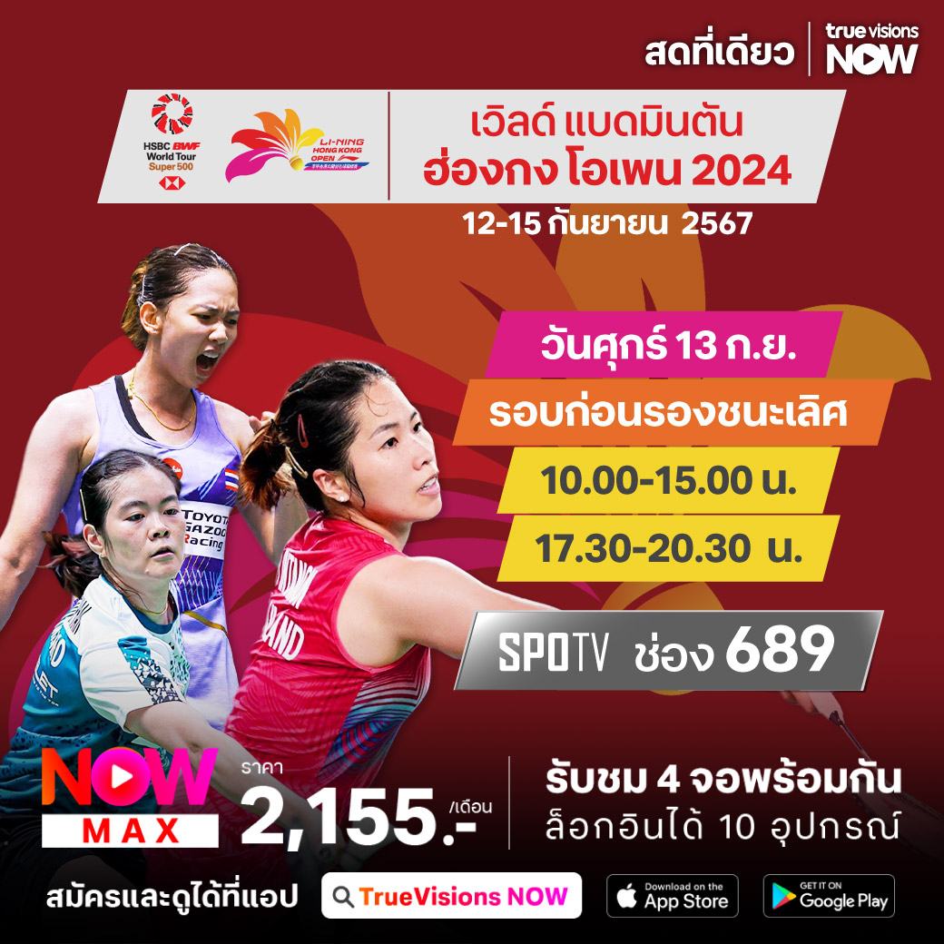 แบดมินตัน บีดับเบิ้ลยูเอฟ รายการ ฮ่องกง โอเพ่น 2024 ความมันส์ระดับ เวิลด์ ทัวร์ ซูเปอร์ 500 ร่วมเชียร์ทีมแบดมินตันไทย สู้สุดใจเพื่อคว้าชัยชนะเหนือคู่แข่งระดับโลก ใครจะเป็นแชมป์ในปีนี้ ลุ้นกันสนุกถึงรอบชิงชนะเลิศ ชมสด เอ็กซ์คลูซีฟ ที่เดียวที่ ทรูวิชั่นส์