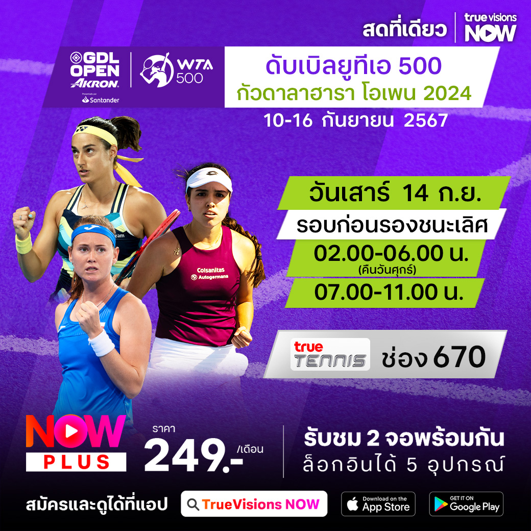 เทนนิสหญิงดับเบิ้ลยูทีเอ ทัวร์ สัปดาห์นี้พบกับรายการระดับ WTA 500 กัวดาลาฮารา โอเพ่น ที่ประเทศเม็กซิโก เป็นรายการต่อเนื่องหลังจากจบศึก ยูเอส โอเพ่น แกรนด์สแลมสุดท้ายของปี ร่วมลุ้นว่าใครจะคว้าแชมป์รายการนี้ไปครอง ชมสด ครบทุกรอบที่ ทรูวิชั่นส์