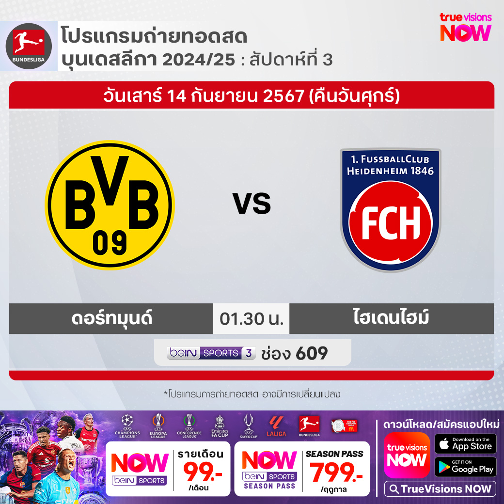 Dortmund vs Heidenheim เวลา 01.30-03.30 ทางช่อง beIN 3 (609)