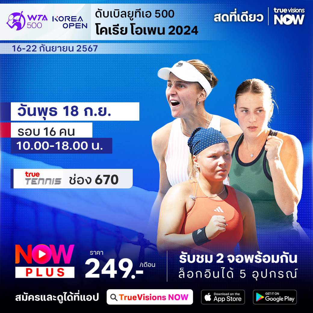 เริ่มต้นช่วงการแข่งขันเทนนิสจากทวีปเอเชีย สัปดาห์นี้พบกับรายการ WTA 500 โคเรีย โอเพ่น จากกรุงโซล ประเทศเกาหลีใต้ บรรดานักเทนนิสระดับโลกมากันอย่างคับคั่ง ร่วมลุ้นว่าใครจะคว้าแชมป์รายการนี้ไปครอง ชมสด ครบทุกรอบที่ ทรูวิชั่นส์