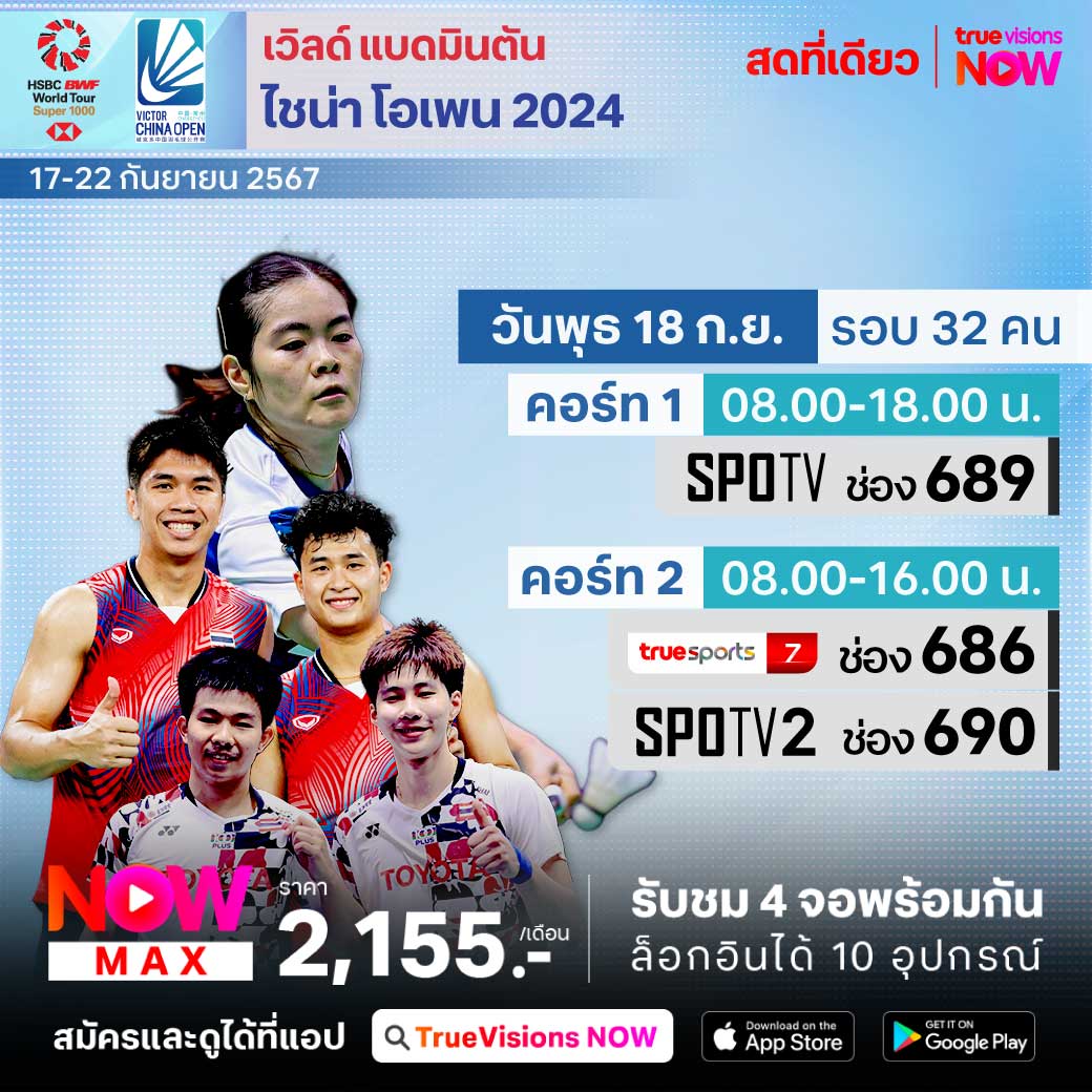 แบดมินตัน บีดับเบิ้ลยูเอฟ รายการ ไชน่า โอเพ่น 2024 ความมันส์ระดับ เวิลด์ ทัวร์ ซูเปอร์ 1000 ชิงเงินรางวัลรวมกว่า 67 ล้าน 5 แสนบาท นักหวดลูกขนไก่ระดับโลกของเจ้าภาพลงชิงชัยและล่าแชมป์ในบ้านเกิดแบบทัพใหญ่สู้กับมือดีจากทั่วโลก รวมทั้งส่งใจเชียร์ทีมแบดมินตันไทยลุ้นเก็บชัยชนะ ชมสด เอ็กซ์คลูซีฟ ครบทุกรอบ ที่เดียวที่ ทรูวิชั่นส์